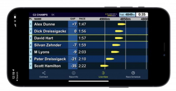 Wir wollten auch den Athleten die Teilnahme so einfach wie möglich machen, was bedeutet, dass sie weder einen Laptop noch USB-Kabel benötigen. Als Teilnehmer brauchen Sie nur einen PM5, unsere neue mobile ErgRace-App (verfügbar für iOS und Android) und eine stabile Internetverbindung. Die Bootsanzeige in der App wird jedem vertraut sein, der schon einmal an einer Indoor Regatta teilgenommen hat und Sie sehen, wie weit Sie vor oder hinter Ihren Konkurrenten liegen. Unmittelbar nach dem Ende des Rennens erhalten Sie die Ergebnisse online in der App, während Ihr individuelles Ergebnis an Ihr Logbook gesendet wird.