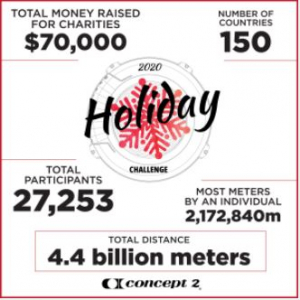 Die Holiday Challenge findet jedes Jahr zwischen dem amerikanischen Thanksgiving und Heiligabend statt. Die Teilnehmer werden aufgefordert, 50k, 100k oder 200k zu rudern, Ski oder auf dem BikeErg zu fahren und ihre Meter im Concept2 Online-Logbuch aufzuzeichnen. Über alle Challenge-Levels hinweg ist die Teilnahme im Vergleich zum letzten Jahr um ca. 50% gestiegen. Das Gleiche gilt für die Anzahl der gesammelten Meter: die Gesamtzahl der Meter sind im Vergleich zu 2019 von 2,4 Milliarden Metern auf unglaubliche 4,4 Milliarden Gesamtmeter angestiegen.