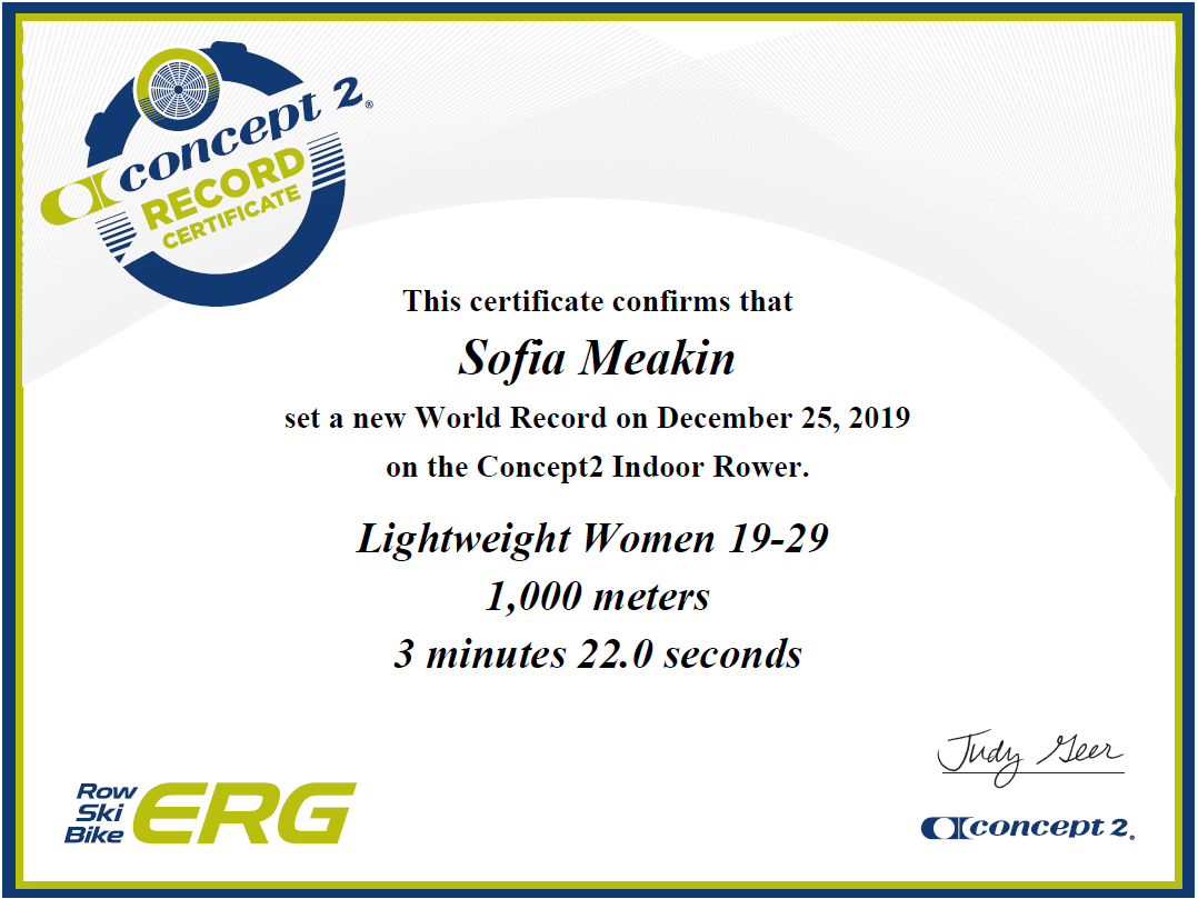 Mit Stolz dürfen wir verkünden, dass Sofia Meakin zu Weihnachten den Weltrekord über 1000m in der Leichtgewichts Frauen Kategorie gebrochen hat.