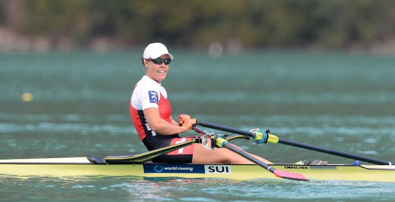Jeannine Gmelin im W1x Frauen Skiff mit Concept2 Skinny Smoothie 2 Vortex Skulls