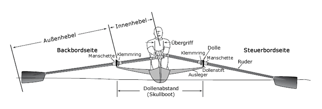 Messen Sie den Dollenabstand (der Abstand zwischen den beiden Dollenstiften). Teilen Sie den Dollenabstand durch 2 und addieren Sie 6-8cm zum Ergebnis, um eine angemessene Innenhebellänge zu berechnen. Stellen Sie Ihre Skulls nun so ein, dass der Abstand zwischen dem Griffende und der Innenseite des Klemmrings dem berechneten Wert entspricht. Ziehen Sie anschließend die Schlauchschellen gleichmäßig fest.