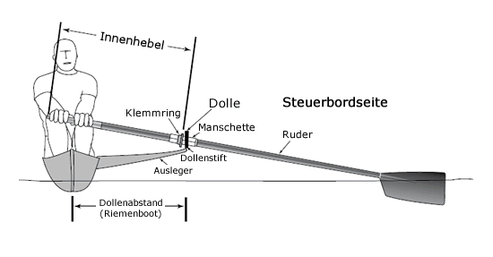 Beim Riemenboot bezeichnet man den horizontalen Abstand zwischen Bootsmitte und Mitte Dollenstift als Dollenabstand. Wenn Sie 29-31 cm zu diesem Wert addieren, ergibt sich eine vernünftige Innenhebellänge. Stellen Sie den Klemmring nun so ein, dass der Abstand zwischen dem Griffende und der Innenseite des Klemmrings der berechneten Innenhebellänge entspricht. Ziehen Sie anschließend die Schlauchschellen gleichmäßig fest.