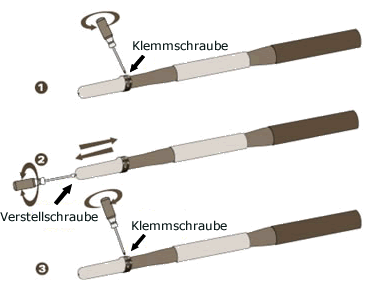 - Drehen Sie die Verstellschraube am Ende des Griffes bis die gewünschte Gesamtlänge erreicht wird und üben Sie dabei etwas Druck auf die Schraube aus. Drehen Sie die Schraube im Uhrzeigersinn, um die Gesamtlänge zu kürzen und gegen den Uhrzeigersinn, um die Gesamtlänge zu verlängern.