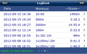 Ihr ErgData-Logbuch befindet sich in der dritten Anzeige und zeigt die Trainingseinheiten an, die Sie mit ErgData absolviert haben.