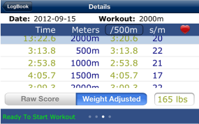- Um verschiedene Leistungswerte anzuzeigen, tippen Sie auf das /500m Feld. Sie können hiermit zwischen 500m Schnitt, Watt und Kalorien pro Stunde wählen. Beim weight adjusted score werden Zeit und Leistungswerte in grüner Schrift angezeigt. Um Ihre unbearbeiteten Trainingsdaten anzuzeigen, wählen Sie Raw Score.