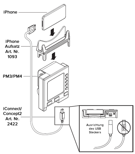 - Legen Sie das iOS-Gerät in die Halterung. (Hinweis: Die Verwendung von der Smartphone Halterung mit dem iPad wird von Concept2 nicht empfohlen, da die Smartphone Halterung nicht für das iPad konzipiert wurde.)