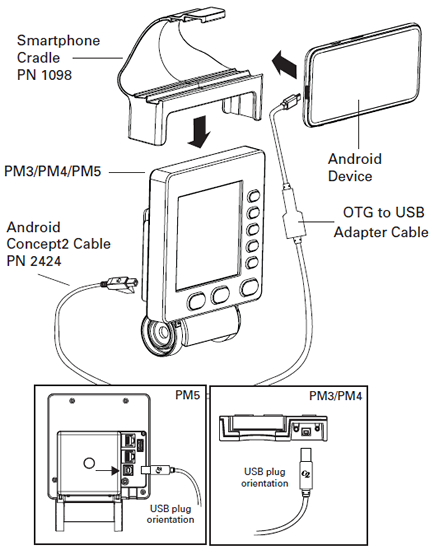 When you plug the OTG Adapter and USB Cable into your Android device and run ErgData, the message at the bottom of the ErgData screen should change to "Please connect PM3 or PM4." If this does not appear, then there is a problem with the Android device connecting to the adapter. Try disconnecting the adapter, blow or clean any dust or debris out of the connectors and try again. If the problem persists, contact Concept2 for assistance.